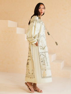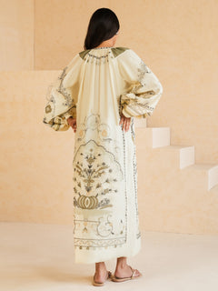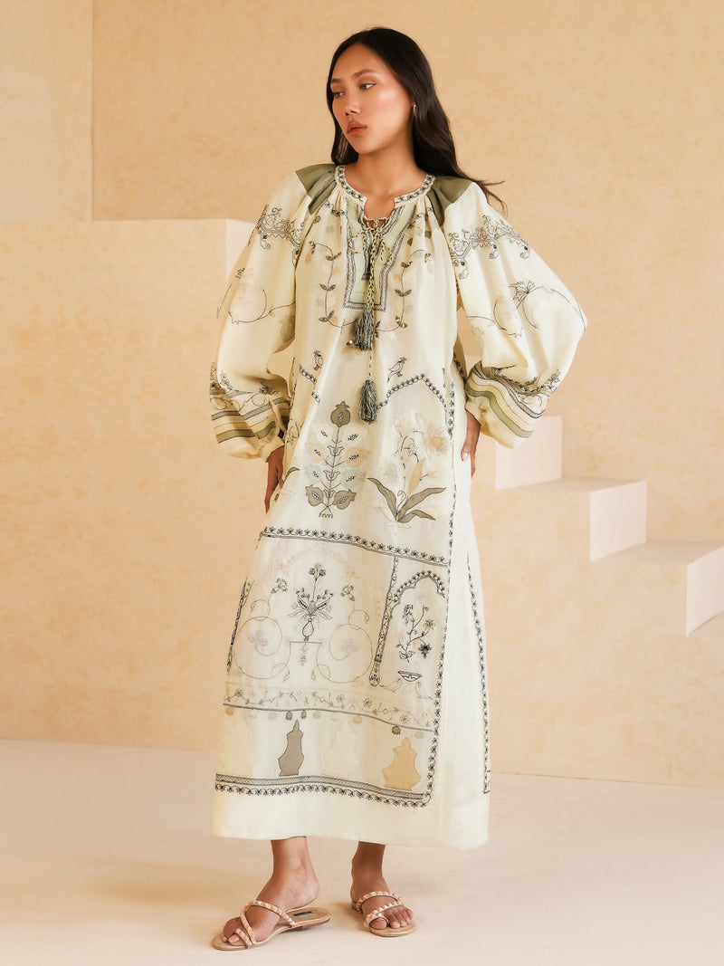 Buy now, love forever. Our ecru Anhar features fine aari embroidery with applique in tonal celadon, sage and black hues inspired by Mughal floral motifs. It is further elevated with hand crafted tassels. It can easily be dressed up or down for all your summer dalliances.